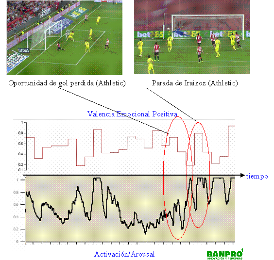 - No solo los goles generan fuertes emociones positivas, 2 paradas meritorias de Iraizoz generan niveles emocionales muy intensos, inicialmente son negativos y al parar Iraizoz se convierten en positivos. Cuando se ve lanzar una falta y el balón se acerca al palo derecho de Iraizoz las emociones positivas descienden bruscamente, pero la parada de Iraizoz despierta la alegría de los aficionados.