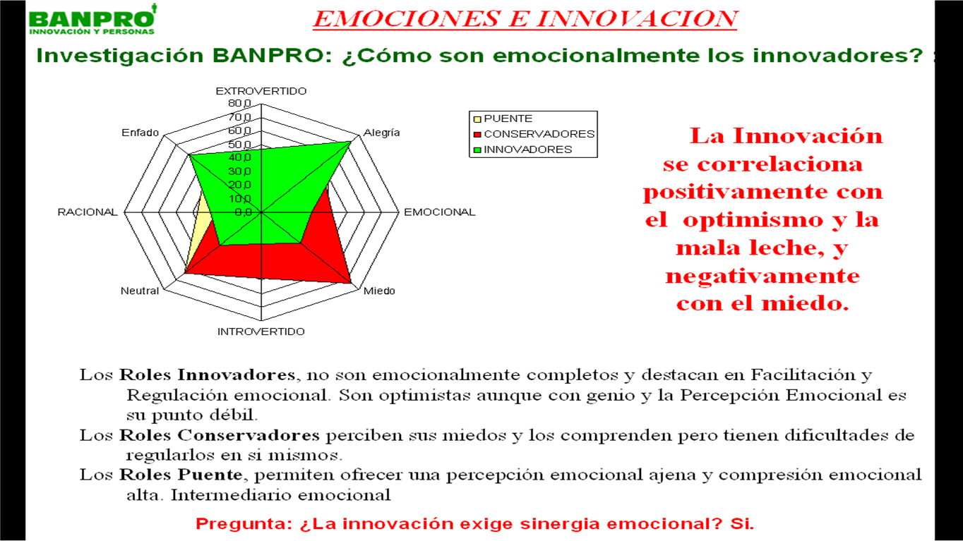 Los innovadores son optimistas, con bajos niveles de miedo y cierta «mala leche». Todas las emociones aportan algo a los procesos de innovación. Se recuerda que los resultados en la innovación vienen de percepciones de clientes, clientes-persona que sienten y que son contagiados emocionalmente por profesionales-persona.