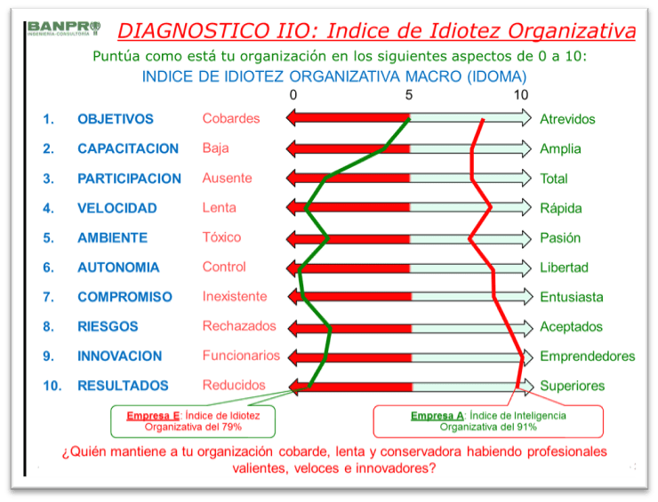 En la empresa E los objetivos son cobardes, la organización es lenta y no se innova. El índice de Idiotez Organizativa es del 79% estando formada por excelentes profesionales!!. En estas empresas la mediocridad manda, se van los buenos… los productos -servicios son muy maduros y la rentabilidad se va desplomando.